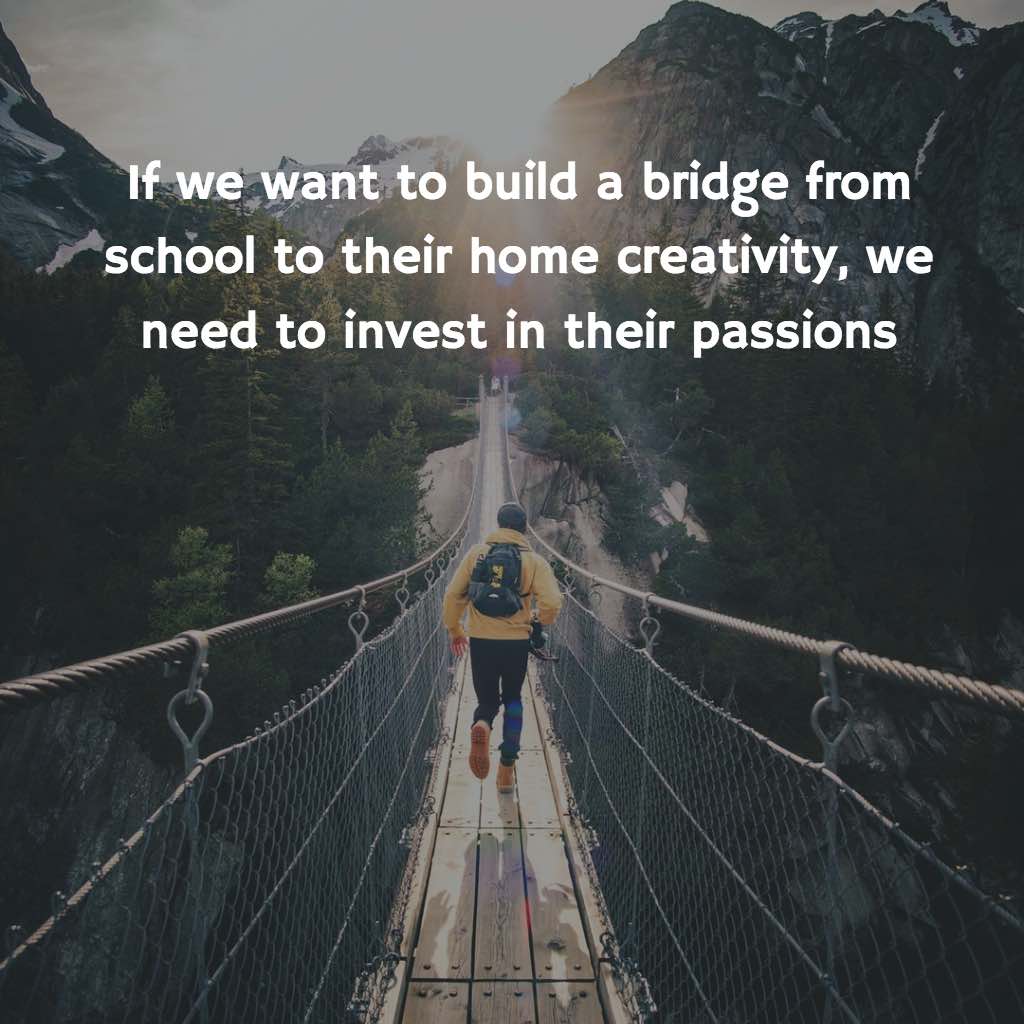 If we want to build a bridge from school to their home creativity, we need to invest in their passions. Each day is an opportunity to engage students’ minds and that comes from planning lessons that dive deeply into critical thinking while at the same time allowing students the chance to showcase that learning using their individual interests.